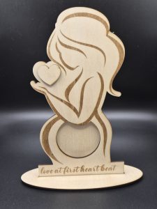 Beautiful frame to hold a 6x6cm scan photo. The photo slides in at the back. Stand is 16cm wide and separate from the frame so it can be kept flat for storage or packaged and given/sent to the receiver. Perfect gift for those beauty memories. Frame comes with a hear that can be colored pink, blue or plain wood. Please select your option at time of purchase.